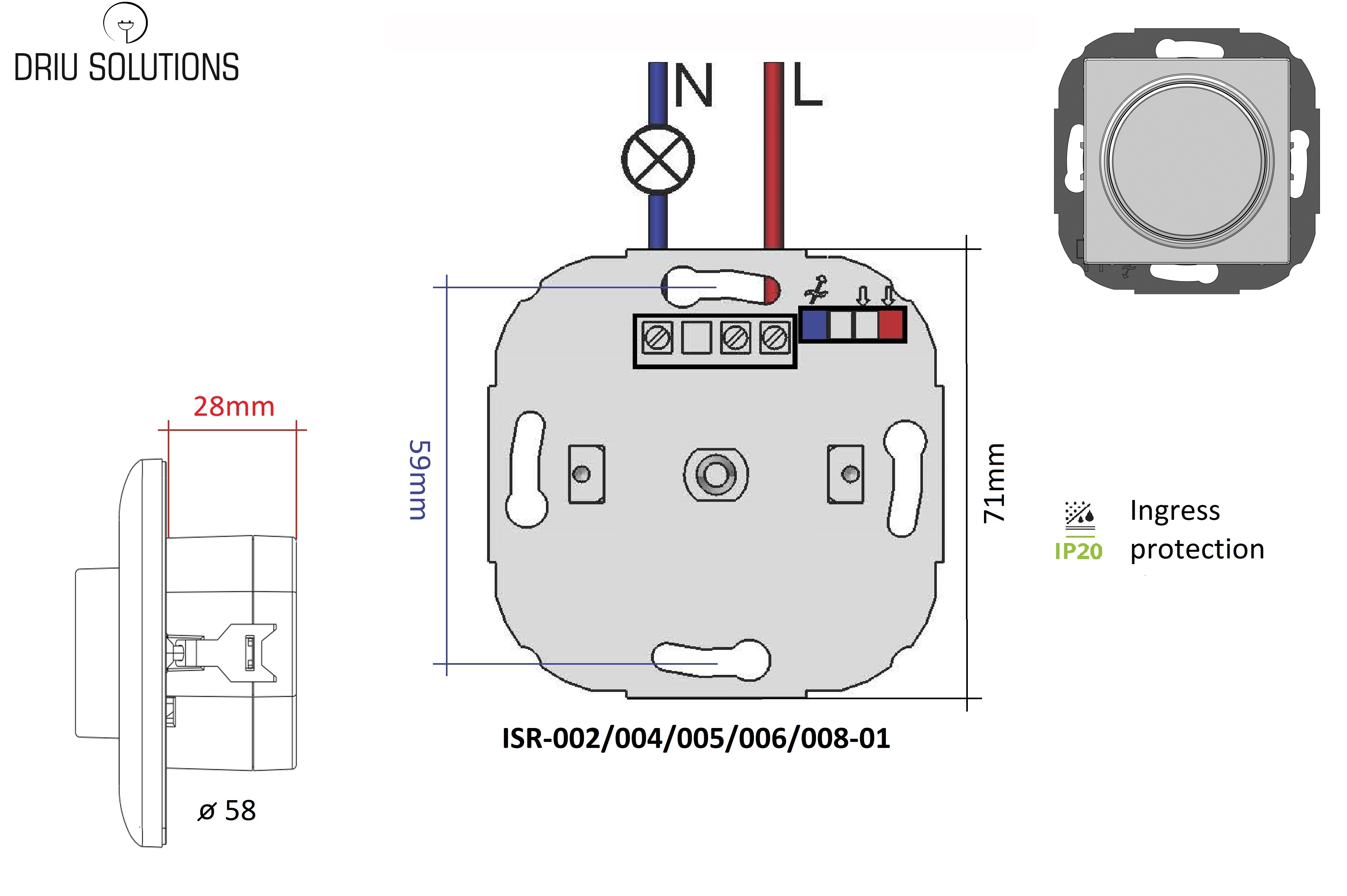 230V+-10%, 50Hz. Tipas "leading edge", įjungtas kaip numatytasis. Gaminys gali dirbti ir "trailing edge", tačiau šį darbo režimą reikia įsijungti (perjungiamas mikrojungikliu, gaminio priekinėje dalyje). Reguliatoriuje yra sumontuotos temperatūrinė, ir trumpo jungimosi apsaugos: gaminiui perkaitus, šis automatiškai atsijungs, ir vėl galės būti įjungiamas tik po visiško atvėsimo.