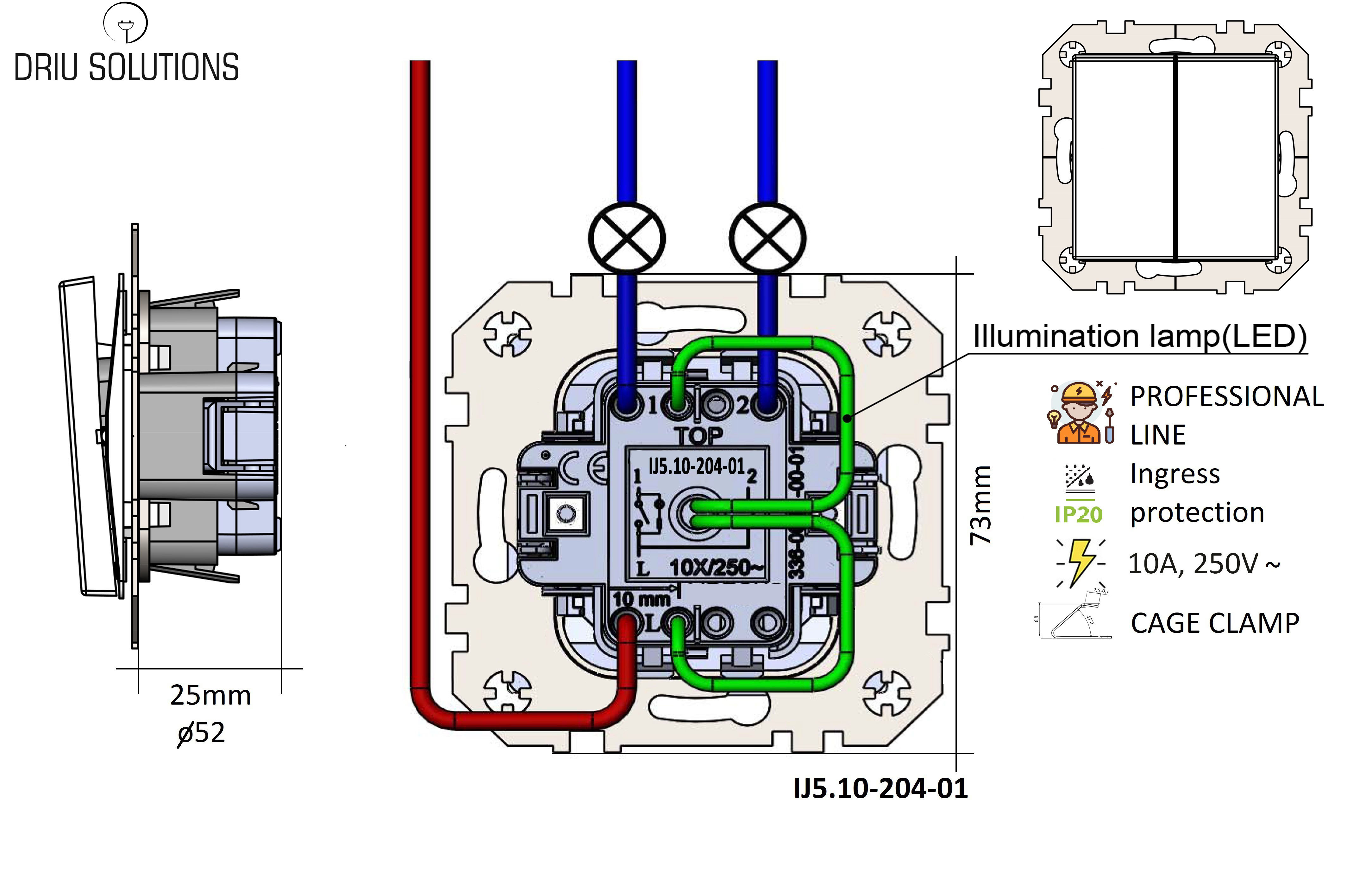 Įleistinis 2kl.jungiklis "Profi" su spyruokliniais pajungimo kontaktais, 10A, be rėmelio. Klasikinio, "Bauhaus" stiliaus, siauras rėmelis su maksimaliai dideliu plotu klavišui. Gaminys tinkamas montuoti horizontaliai/vertikaliai su SUPERIOR serijos DEEP ULTRAMARINE BLUE rėmeliais (1-5 vietų). Spec. užsakomų prekių gamybos terminas: 10 darbo dienų.