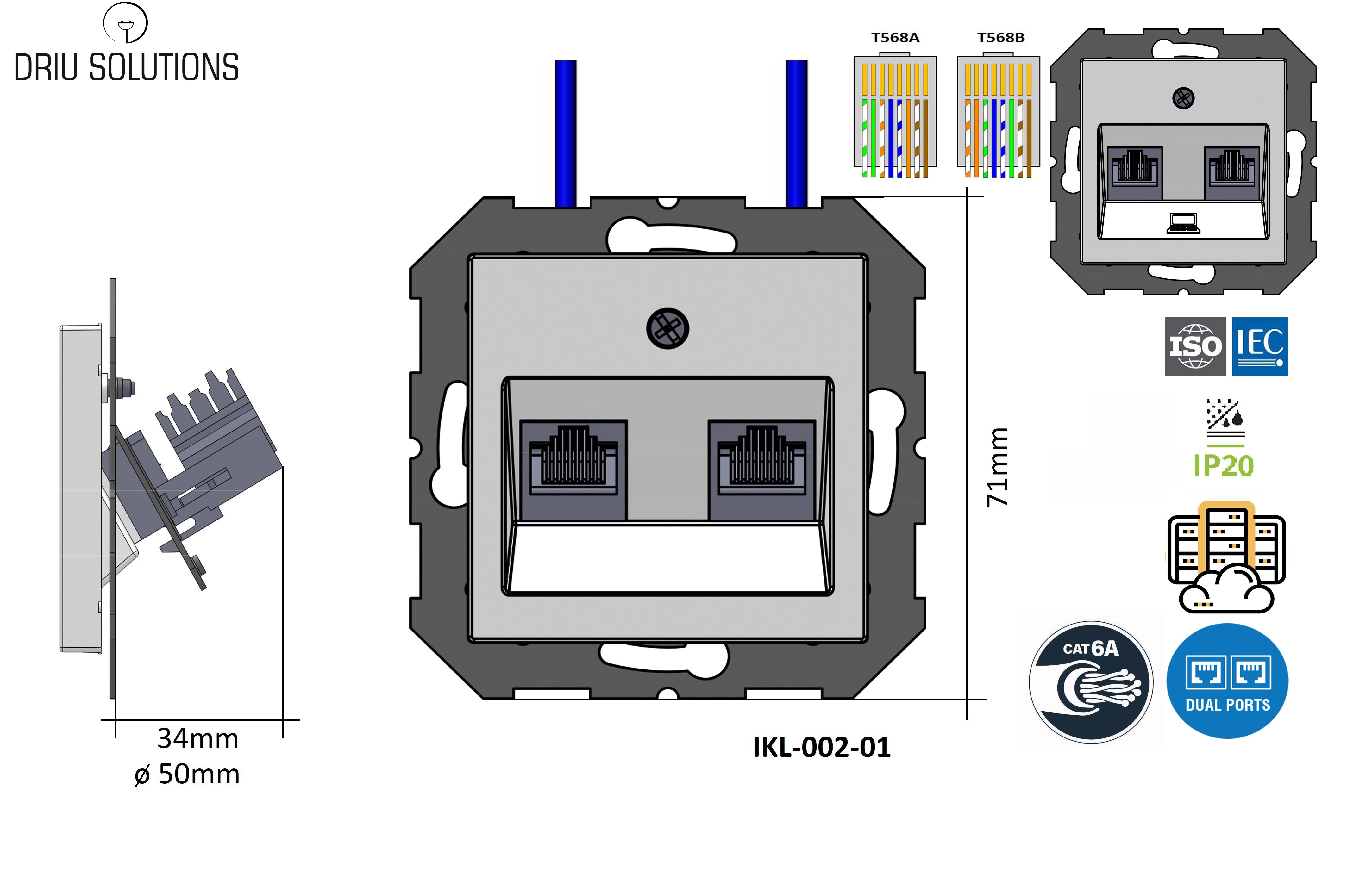 Kompiuterio lizdas, 2x RJ45. Cat 6A, be rėmelio. IKL-002-01.S_GM